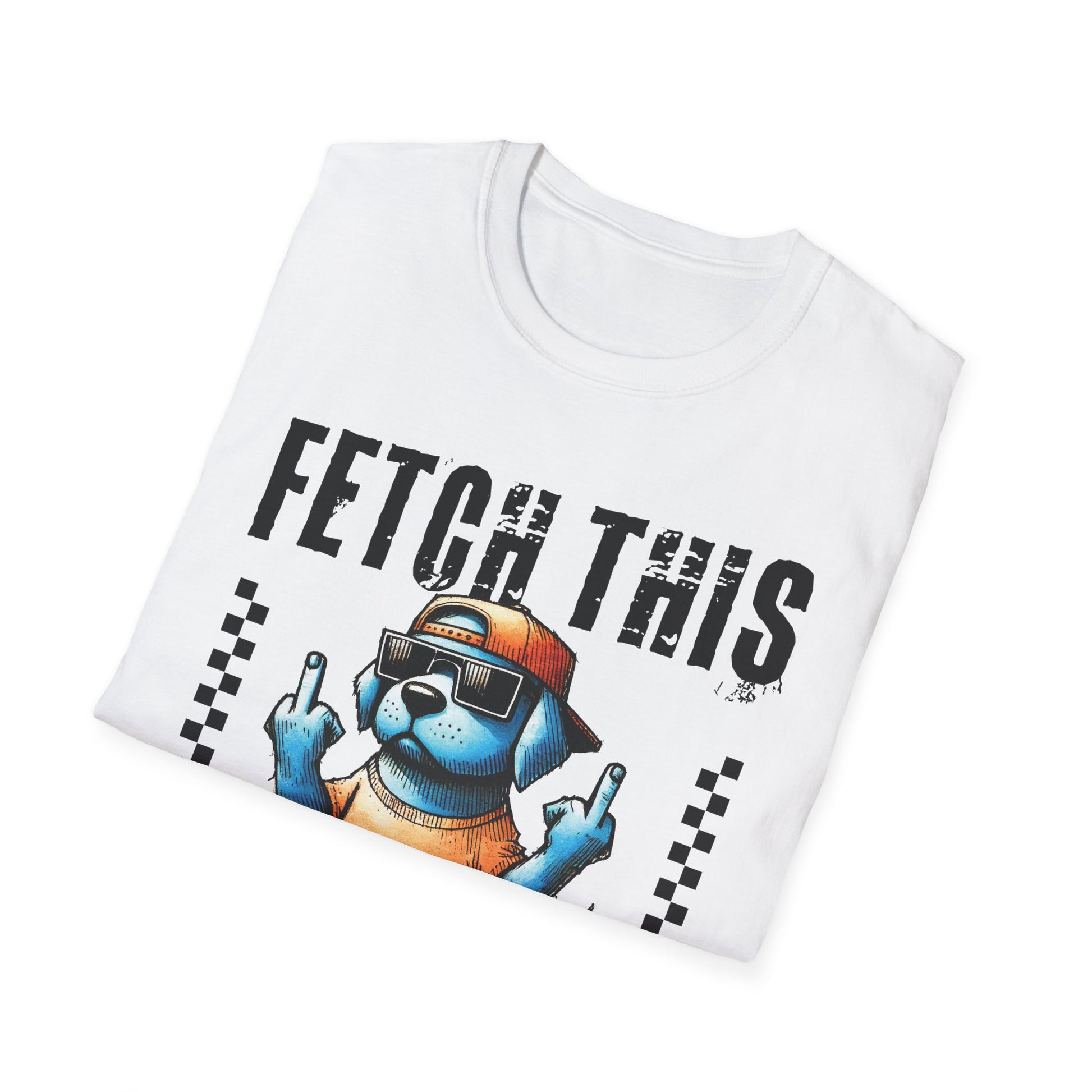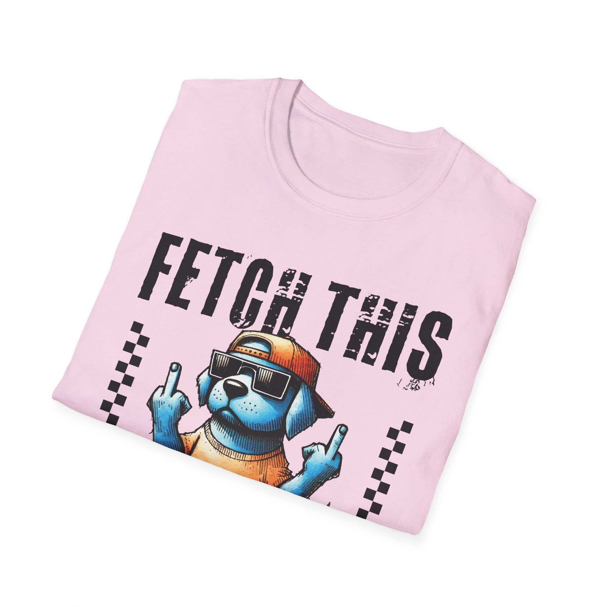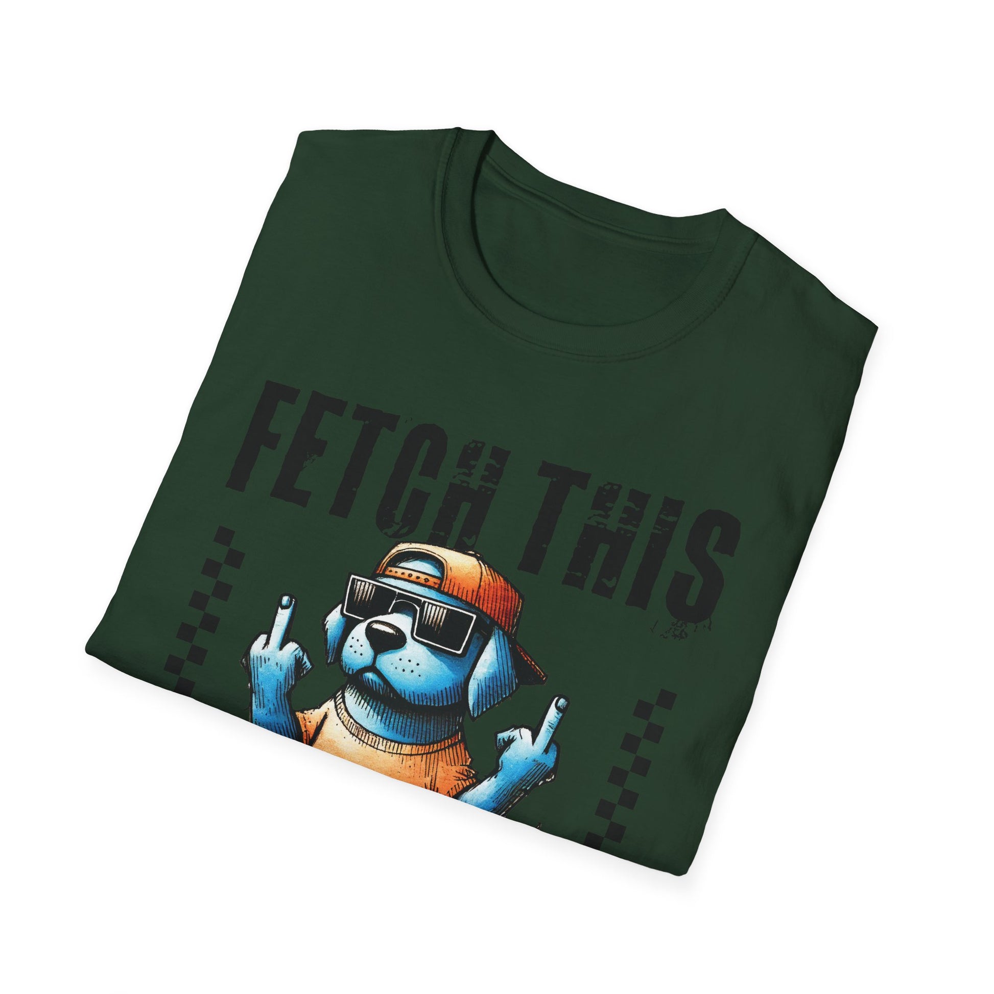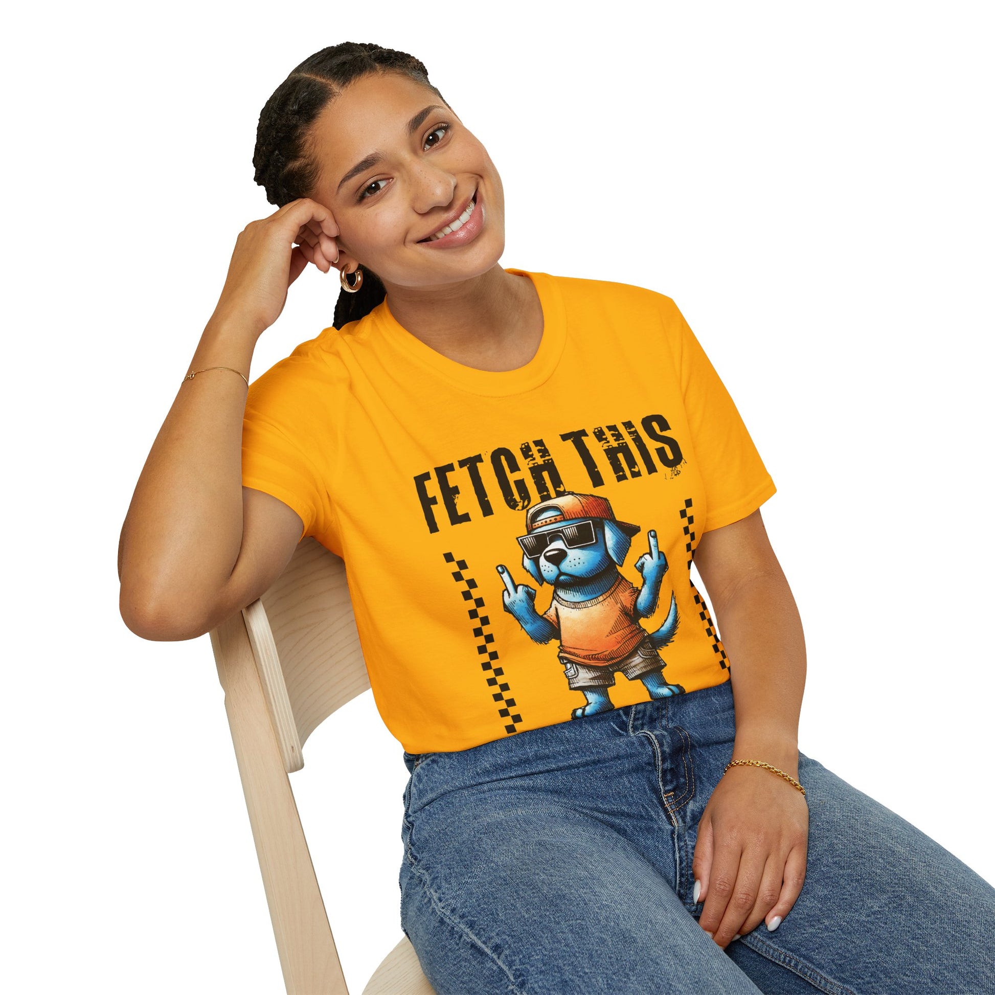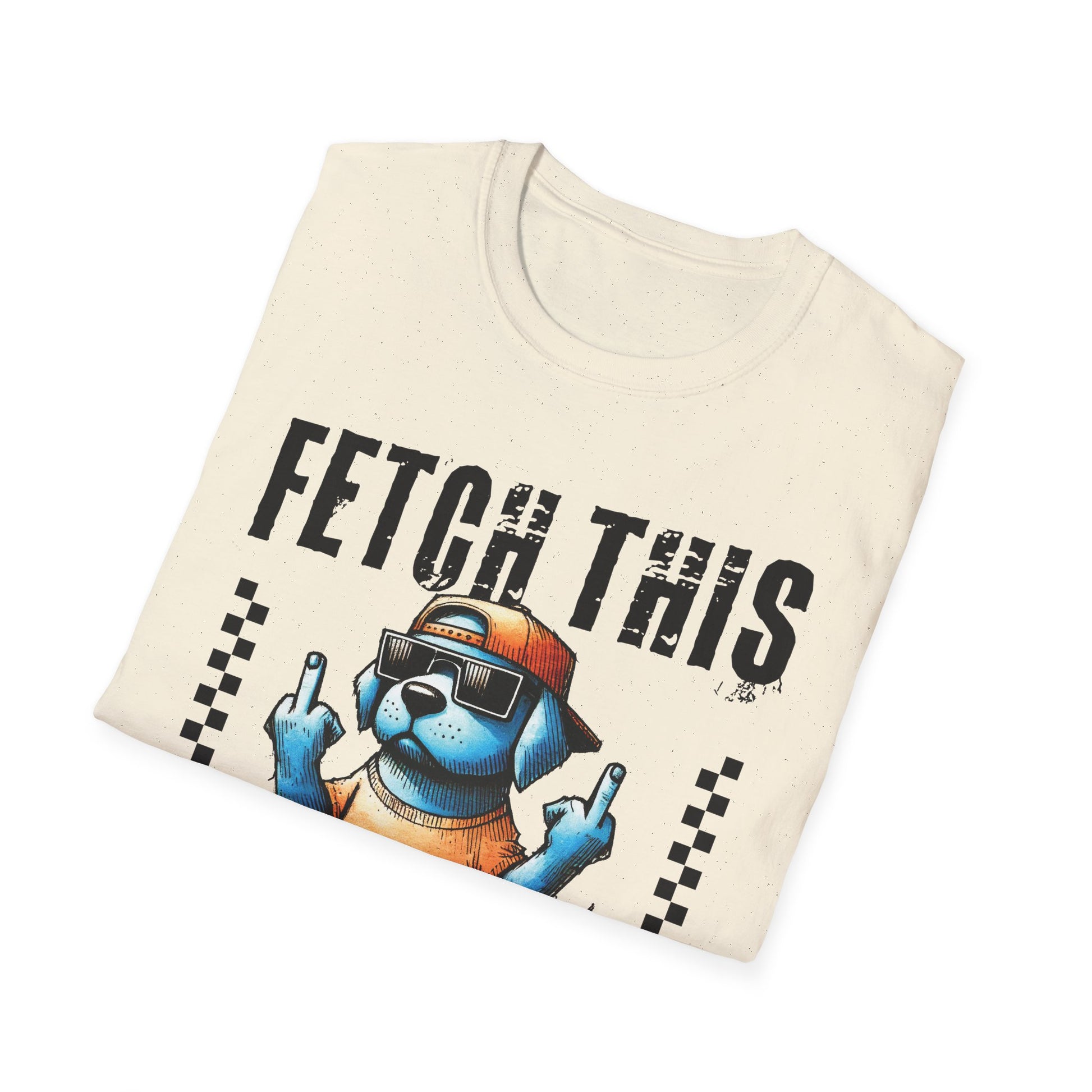 Wear a little attitude with this soft, lightweight tee that brings playful swagger to everyday wear. The front shows a bold, cartoon dog in shades of blue, wearing a backwards cap and sunglasses and flashing a sassy hand gesture beneath the cheeky “FETCH THIS” headline. The image pops crisply on the smooth ring-spun cotton, while the clean crew neckline and classic fit keep the look easy and comfortable. It sits naturally in a relaxed wardrobe — for casual walks, mellow weekends, or those moments when humor and personality speak louder than words.