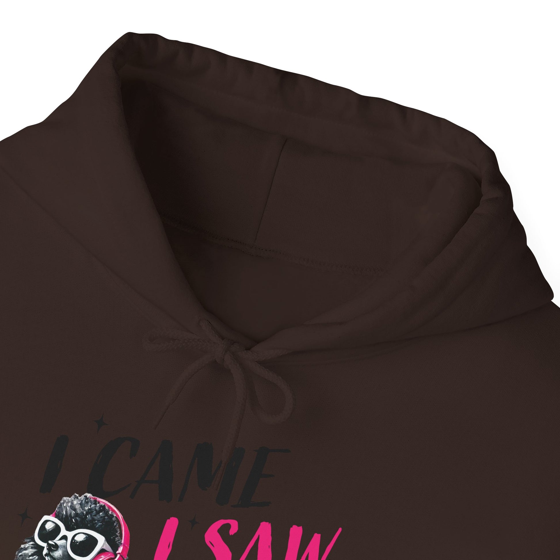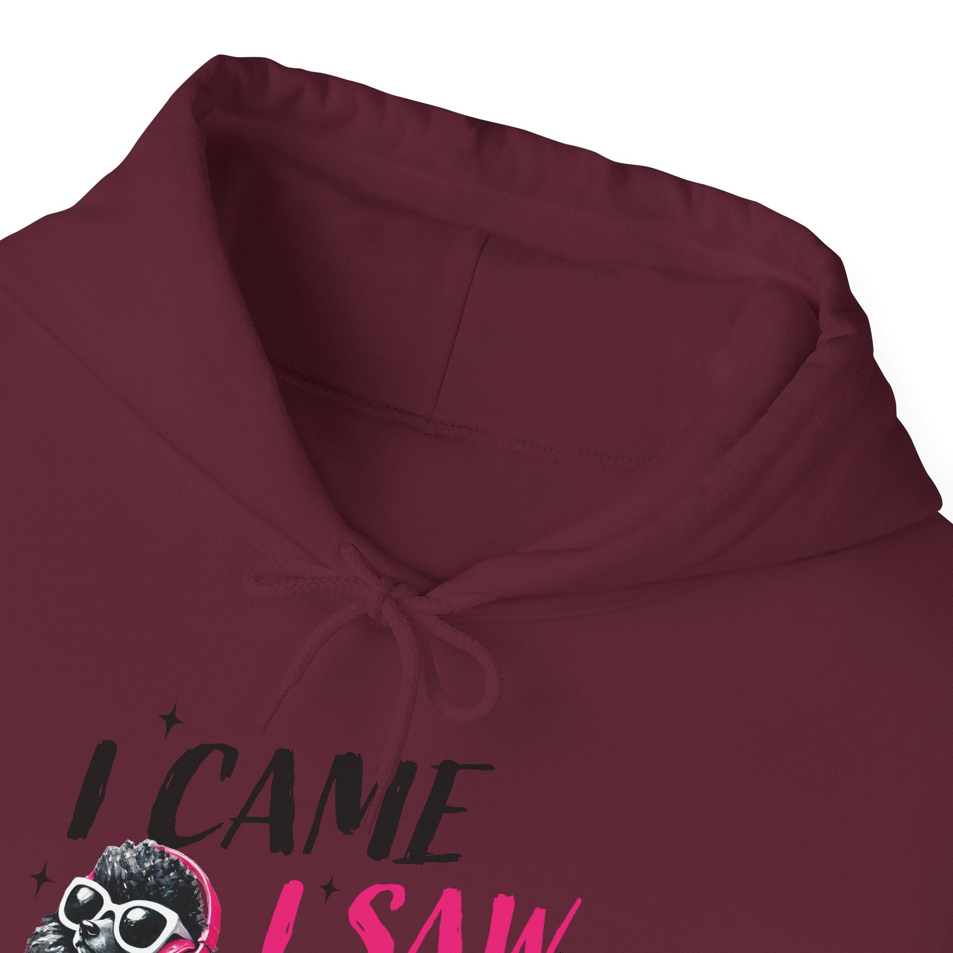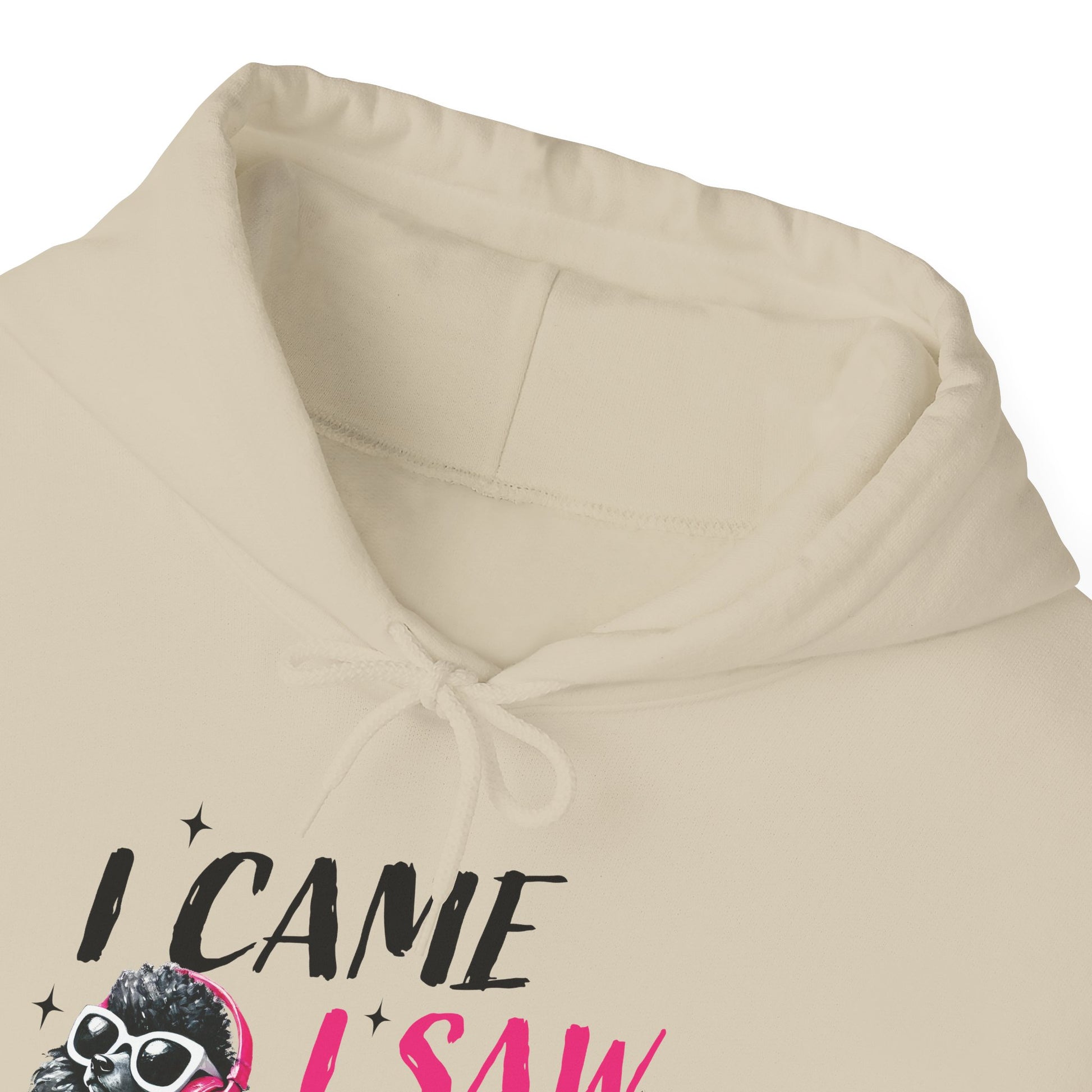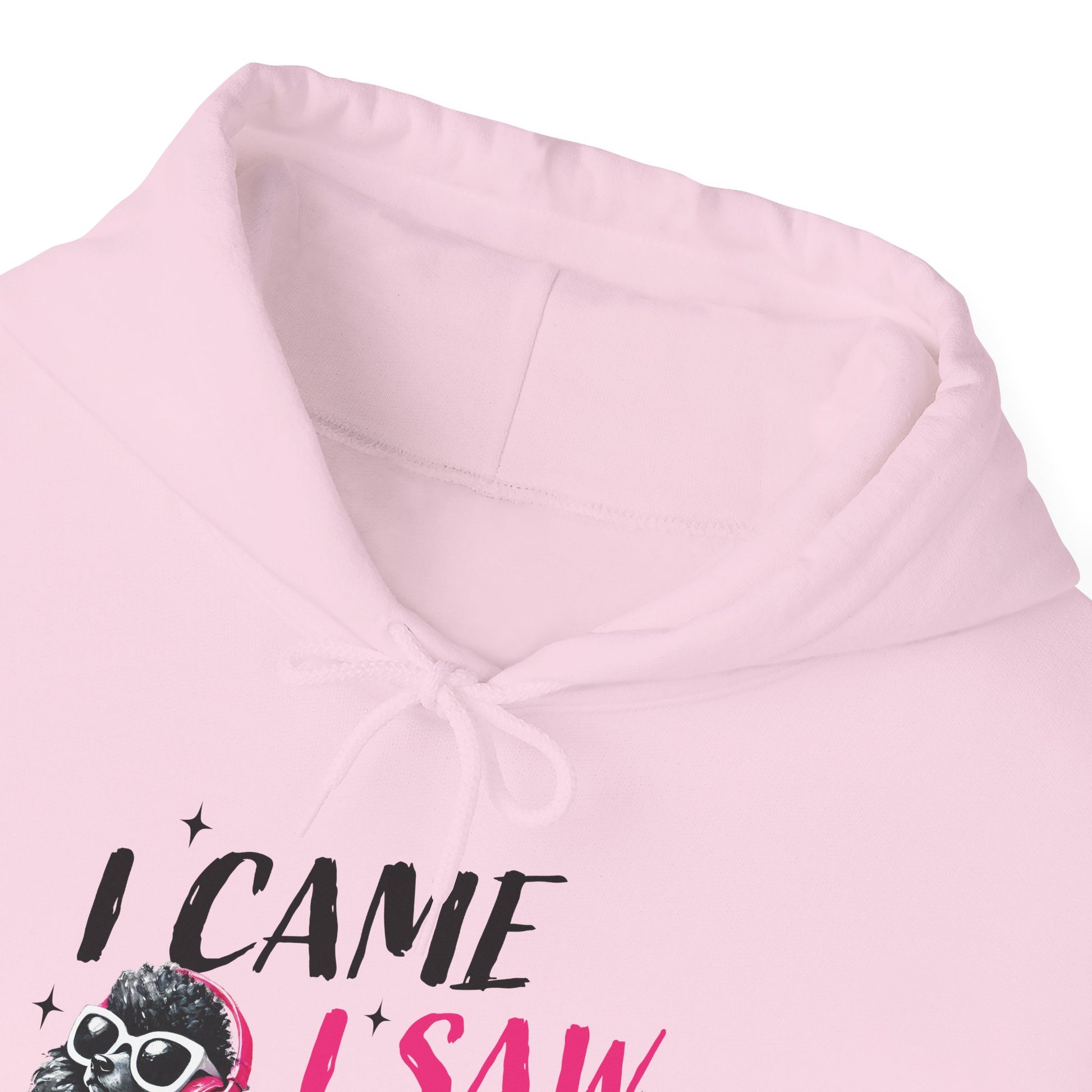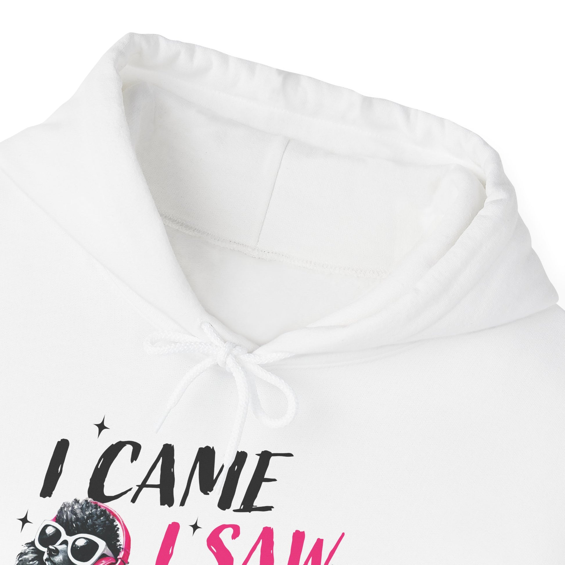 Soft, roomy, and a little bit sassy — this cozy hoodie carries a playful attitude. A hand-drawn black poodle wearing pink headphones struts across the chest beside the cheeky line “I came, I saw, I ignored you.” The white fleece background makes the black-and-pink artwork pop, while the double-lined hood and kangaroo pocket keep things warm and practical. Lightweight yet substantial, it’s the kind of sweatshirt you reach for when you want comfort without losing personality. Wear it during slow mornings, coffee runs, or low-key hangouts to signal quiet confidence and dry humor.